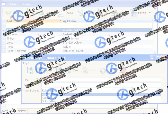 | Açılan "Doktor Görevleri" listeleme ekranında daha önceden oluşturulmuş kayıtlar varsa görevi seçildikten sonra menüde bulunan "Seç" simgesine de tıklanarak seçilen görev tanımı ilgli doktorun görevi alanına eklenir. Daha öncesinde hiç kayıt eklenmemiş ise yada yeni bir görev eklenecekse menüde bulunan simgesine tıklanır. |
