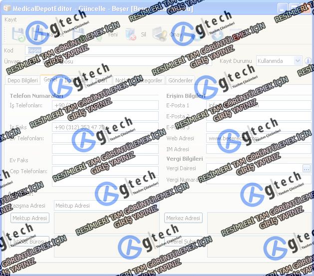 | Ecza depo kaydında bulunan 2. sekme ise "Genel". Bu alanda ecza deposuna ait genel iletişim bilgileri yer almaktadır. Ecza deposuna ait iş telefonları / faks numaraları, adres bilgileri , e- posta ve web adres bilgilerinin hepsini buraya kayıt edebilirsiniz. |